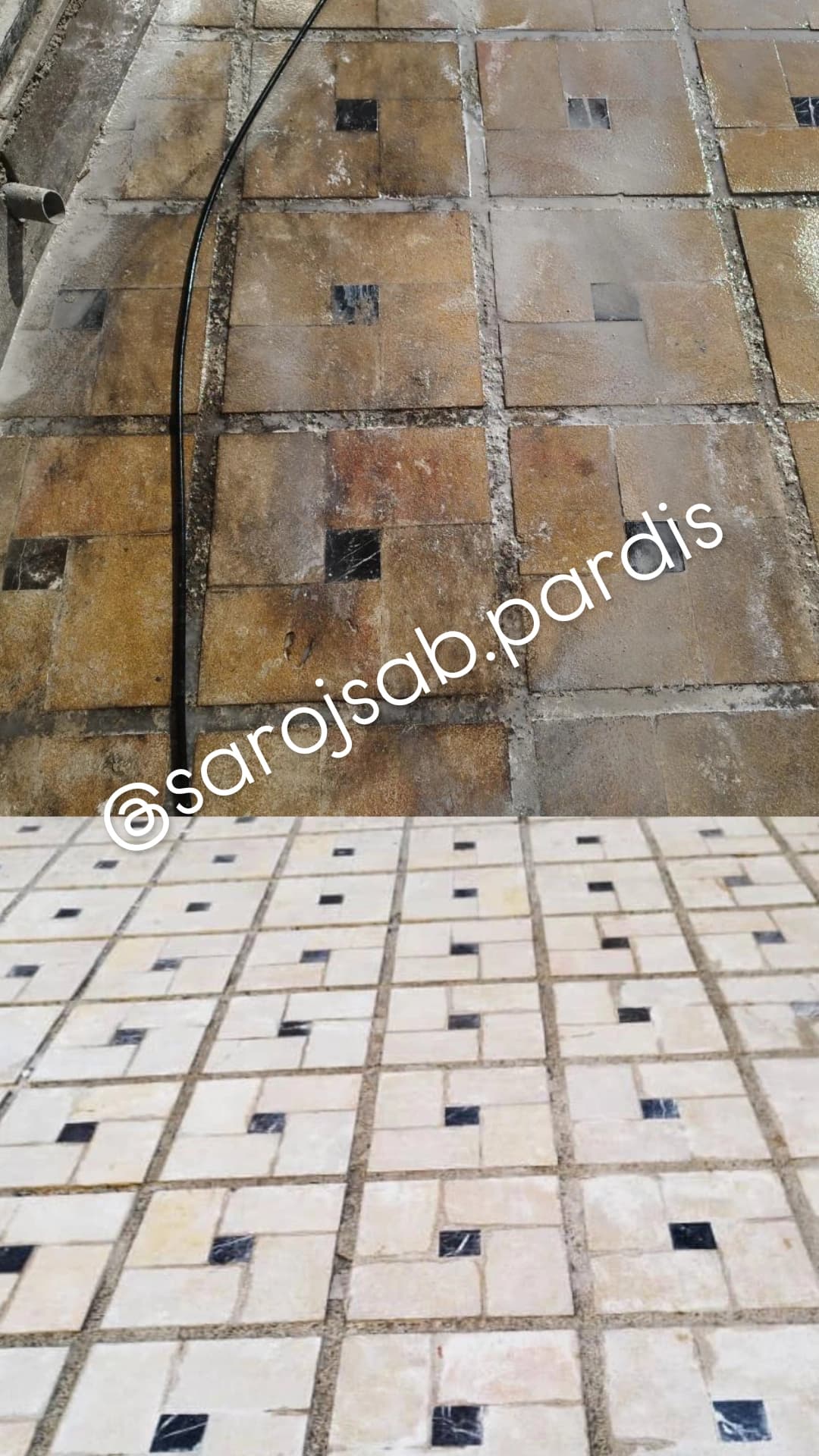 عکس نمونه کار پاک و تمیز کردن جرم از سنگ کف برجسته با استفاده از واتر جت و متریال سیلیس شویی بجای کفسابی یا فرچه سابی سنگ برجسته در پردیس